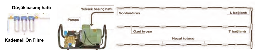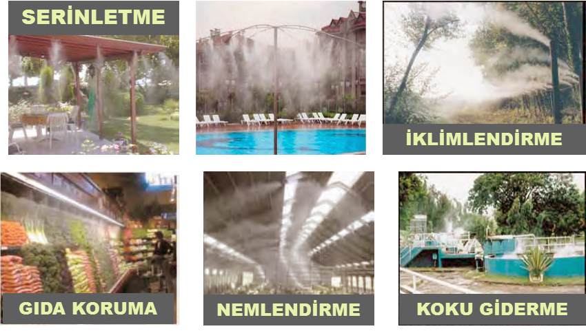 | | Suyun yüksek basınç altında mikron büyüklüğünde zerrelere parçalanmasıyla, uygulama yapılan ortamda SİS oluşur.Sistemin kalbini oluşturan 70 bar lık yüksek basınç pompası suyu benzer yöntemlere göre çok daha küçük zerrecikler haline getirir. Bu yöntemle oluşan zerreler o kadar küçüktür ki ; ( 5 – 15 mikron) Havada askıda durduğu gibi , ortamın nemine bağlı olarak kısa sürede buharlaşır. |